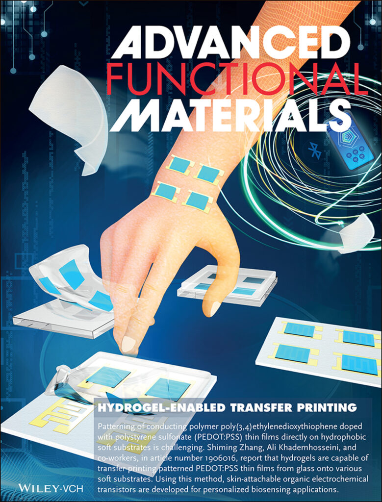 Zhang, S.*+, Ling, H.+, Chen, Y., Cui, Q., Ni, J., Wang, X., Hartel, M.C., Meng, X., Lee, K., Lee, J. and Sun, W., Lin, H., Emaminejad, S., Ahadian, S., Ashammakhi, N., Dokmeci, M., Khademhosseini, A.*, Hydrogel‐Enabled Transfer‐Printing of Conducting Polymer Films for Soft Organic Bioelectronics . Advanced Functional Materials , 2019, Cover .