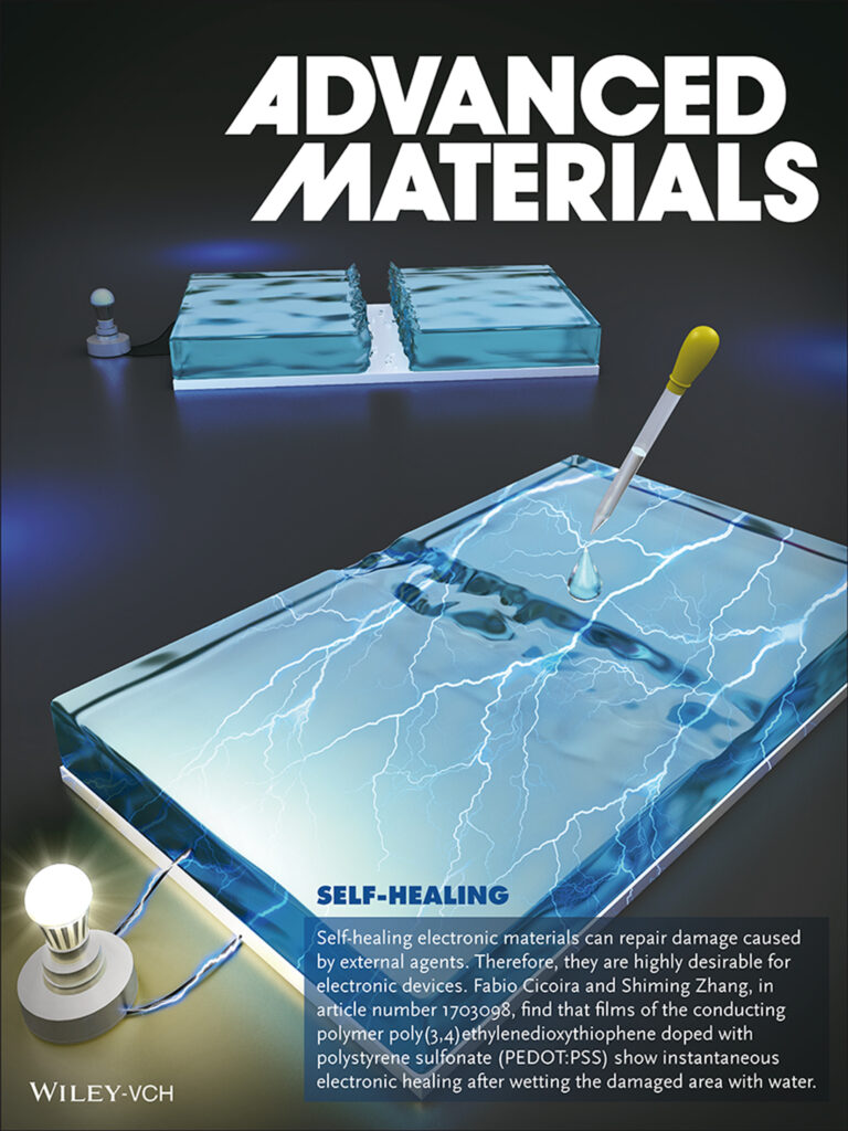 Zhang, S. and Cicoira, F.*, Water‐Enabled Healing of Conducting Polymer Films . Advanced Materials , 2017, Cover .
